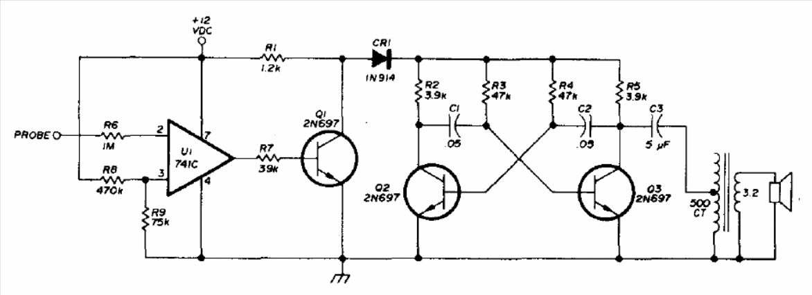 We found this logic level indicator in a 1976 amateur radio documentation. The circuit is powered by 12 V, used for tests in TTL and CMOS logic. The output transformer is the type found in transistor radios and the transistors can be BC548.