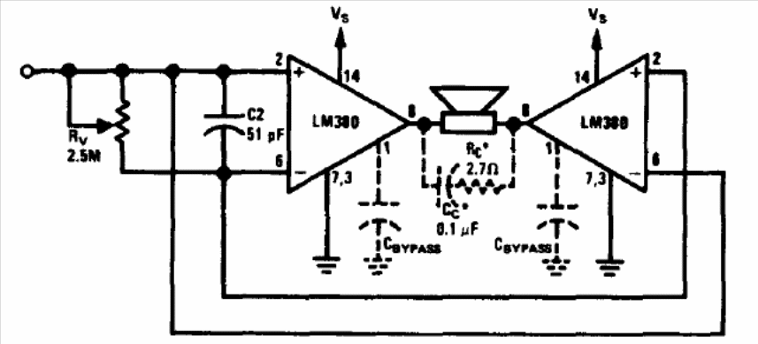This amplifier can be powered with voltages from 9 to 14 V providing 7W of maximum power under a 8 ohms load. The circuit is from the 1994 National Semiconductor Linear Applications Handbook. The volume control is of the common mode type.