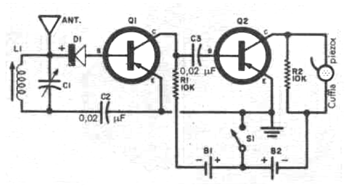 This circuit originally uses germanium transistors having been obtained in a publication in 1960. However, the circuit can be made with silicon transistors and the supply made with two sets of 3 V (two batteries). The antenna depends on the signal strength and the coil consists of 100 turns of wire 28 in a ferrite rod. The variable can be obtained from an abandoned medium wave radio.