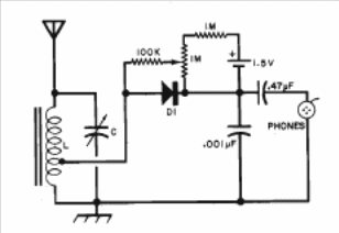 This circuit is from a 1977 publication and is characterized by an adjustment of the polarization point of the diode (which can be germanium or silicon) to obtain greater sensitivity. The coil consists of 100 turns of wire 28 in a ferrite rod and the tuning capacitor is obtained from an unused transistor radio. The earphone must be crystal.