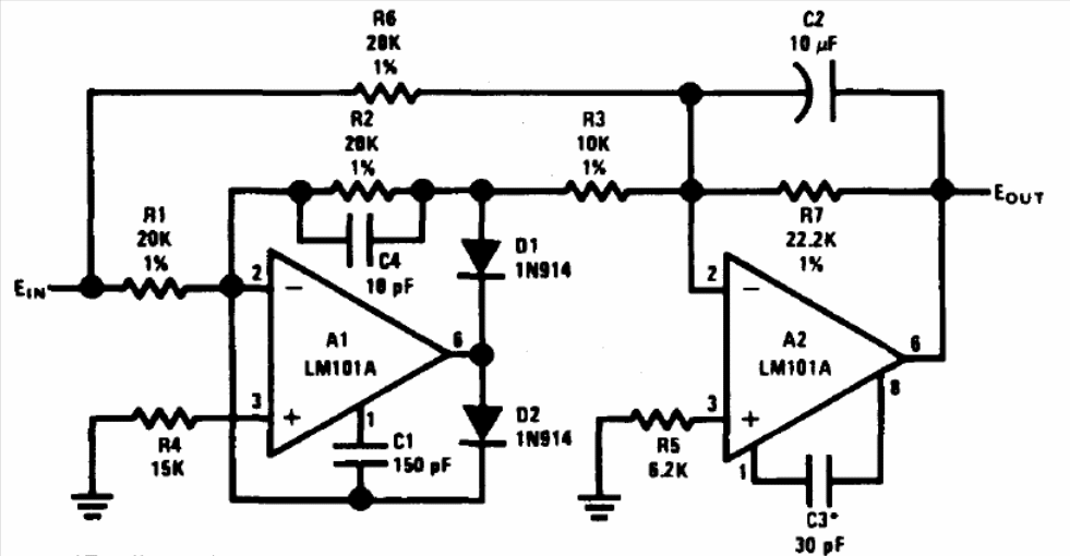 The presented circuit was found in the National Semiconductor's Linear Applications Handbook from 1994. The circuit can be made with other operational ones and the components can be approximated by others of less precision if it is not necessary. The power supply must be symmetrical.