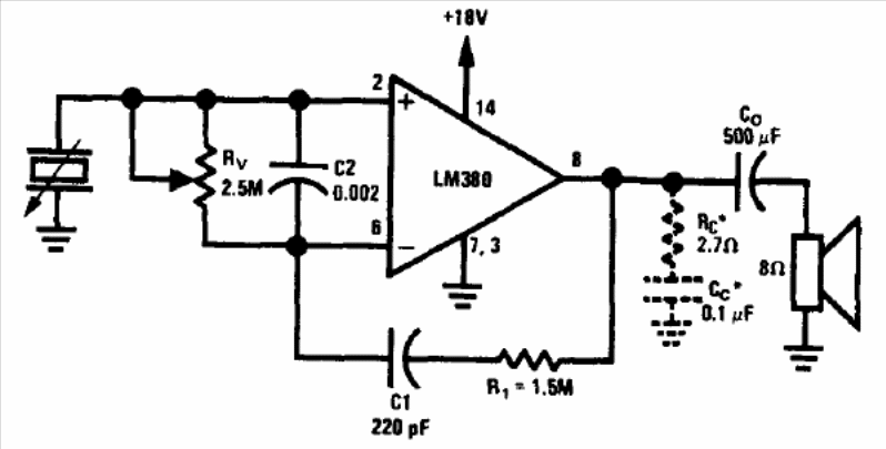 This amplifier, with a power that reaches 3 W, according to the power that can be from 9 to 14 V, was found in the Linear Applications Handbook by National Semiconductor. The circuit is for piezoelectric phonographic capsules found on old record players.