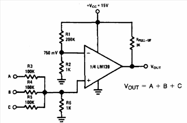 The presented logical configuration uses one comparator of the four existing in an LM139 or equivalent. The circuit was found in the National Semiconductor Linear Applications Handbook of 1994. The power supply does not have to be symmetrical.