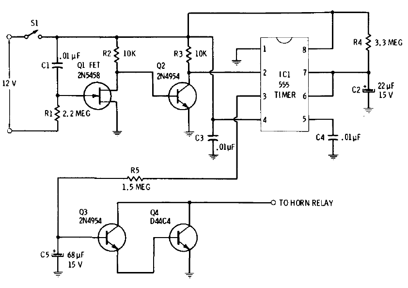 This circuit is intended to detect when current flows through the opening of a car door. The circuit fires the horn for 90 seconds. The FET can be the BF245 and the NPN transistors can be the BD135.