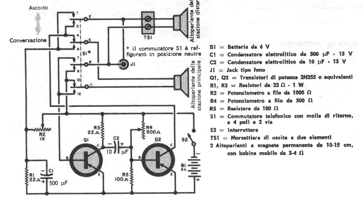 The circuit presented is from a 1969 Radiorama magazine (Italy), and can be designed with more modern components such as the BD136 transistors and the power supply by source or medium batteries. The cables must not be more than 20 meters long. R4 adjusts the resting current for lower consumption without distortion.