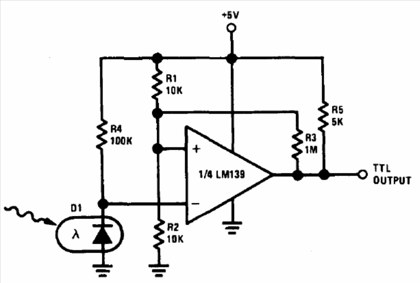 The circuit shown, for reading perforated paper or the presence of paper, was suggested by National Semiconductor in its Linear Applications Handbook. The circuit has a TTL compatible output and is powered by a 5 V source.