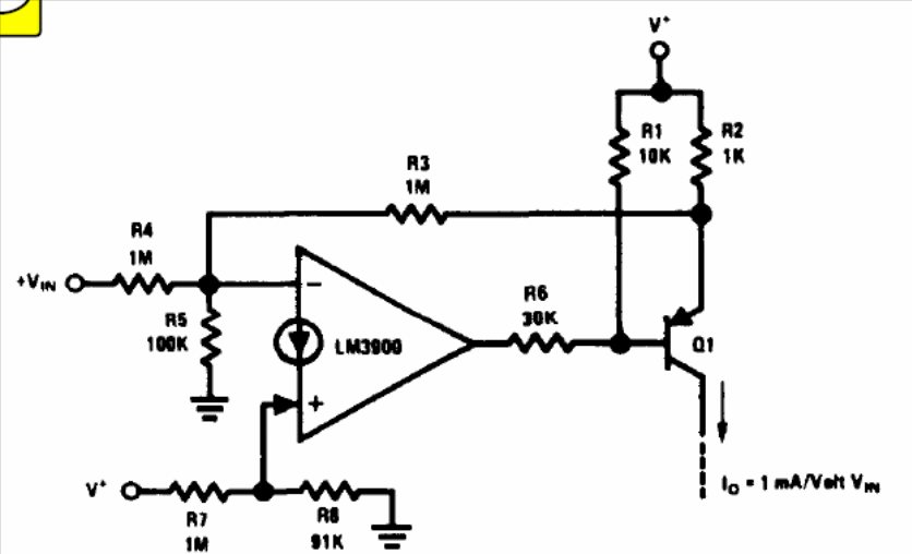 The circuit shown is from National Semiconductor's Linear Applications Handbook. The LM3900 is a transconductance operational amplifier. Transistor Q1 can be a BC558 for the 1 mA current, given as an example.