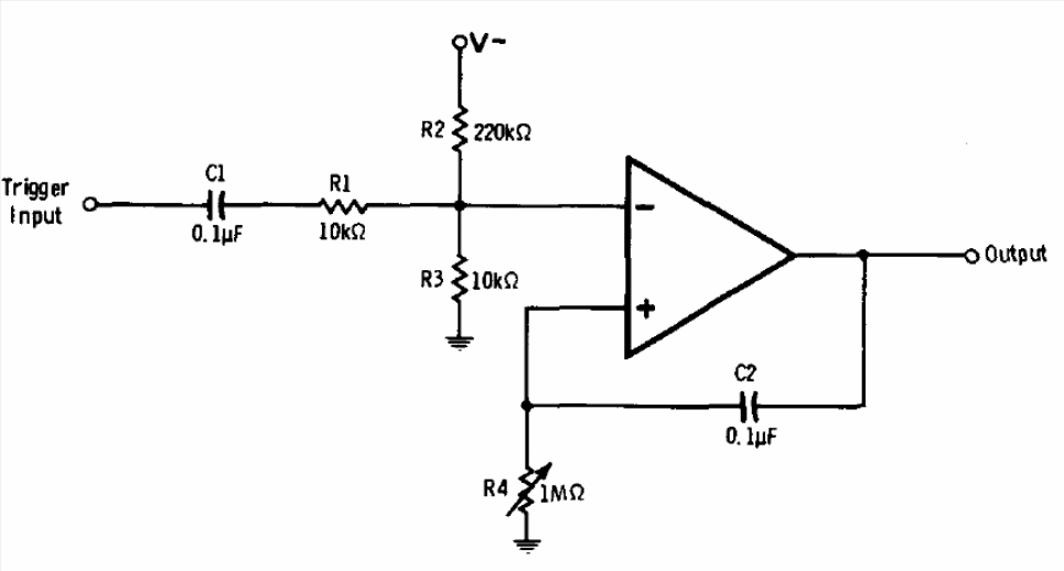 This circuit is from an old publication on operational amplifiers. The circuit can be developed with almost any operational amplifier and must use a symmetrical power source. The time constant is given by C2 and the setting of R4.