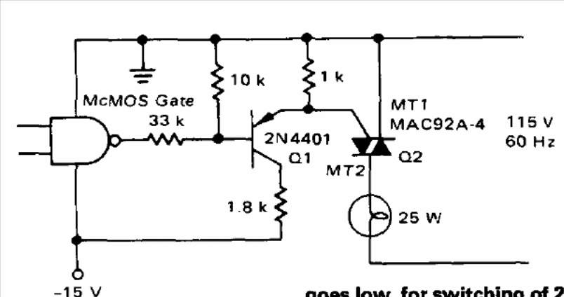 The circuit shown is from a 1975 Motorola thyristor manual. The triac can be of the TIC series and the transistor is a BD136. The circuit controls a lamp, but it can be used for other purposes. As a shield, the CMOS must be powered with 5 V and eventually the reduced 33k resistor.