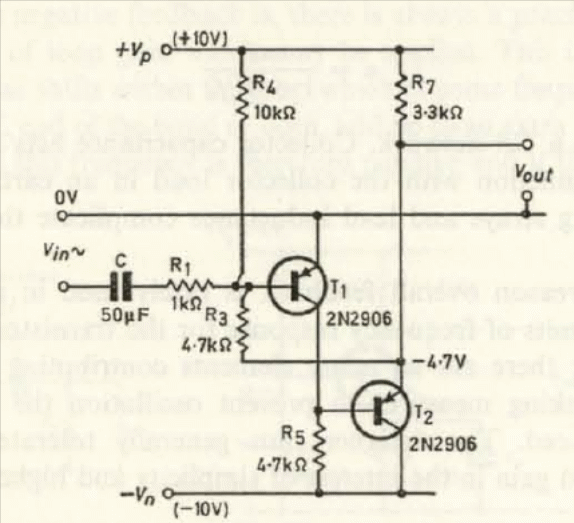 This circuit uses PNP transistors that can be BC558, but if the power is reversed, BC548 can be used. The circuit is from an old publication and operates with signals in the audio band.