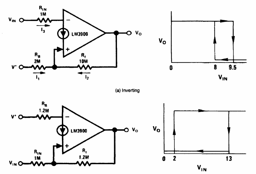 In the figure below we have two triggers made with the LM3900 transconductance operational amplifiers. Circuits are suggested by National Semiconductor in its Linear Applications Handbook, published in 1994.