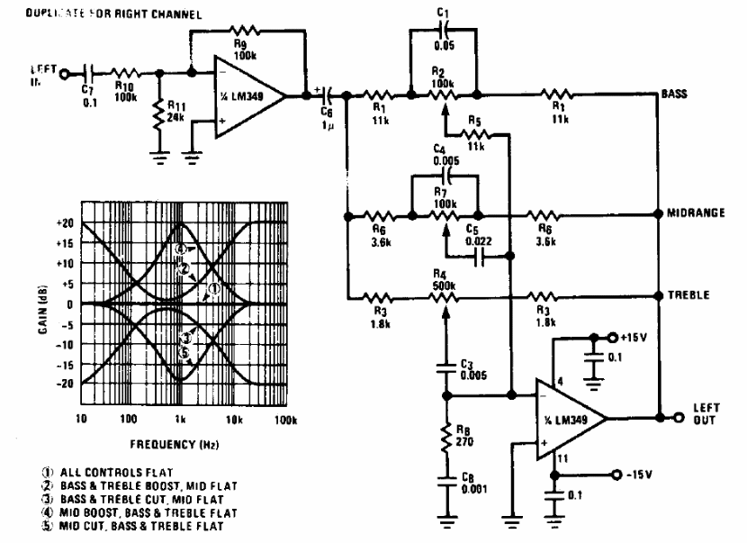 This tone control was obtained in the Audio Handbook of the National Semiconductor of 1977. The circuit controls the signals of medium frequencies in a wide dynamic range as shown in the diagram.