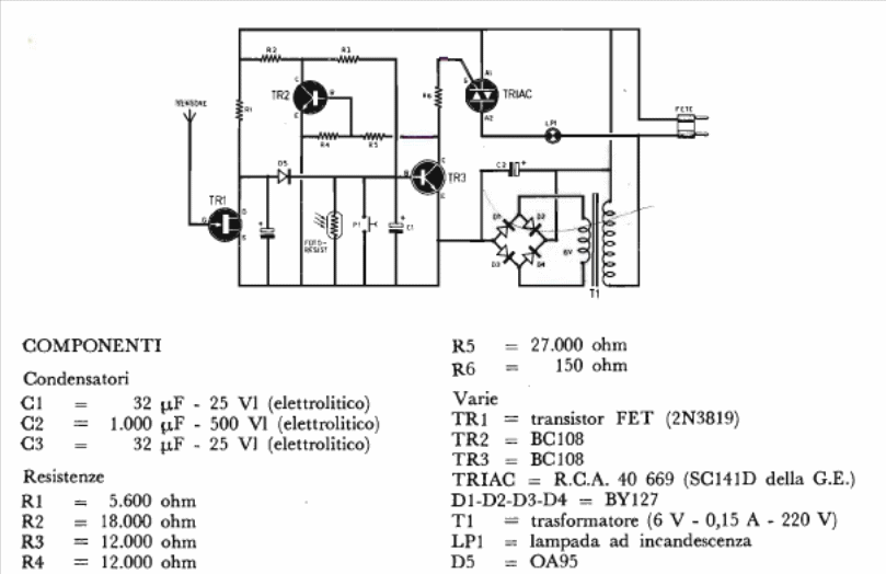 The circuit presented is from a 1977 Italian magazine (Elettronica Pratica). We can mount it with BC548 transistors and the triac can be any of the TIC series. The rectifier diodes can be 1N4002 and FET or BF245. The antena wire must not be long.