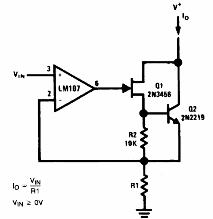 This circuit is from the 1994 Linear Applications Handbook. The operational circuit can be equivalent, and the transistors can be equivalent. We can use BF245 for FET and hi BD135 for currents up to 500 mA as Q2.
