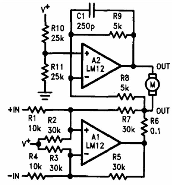 The LM12 integrated circuit can control motors up to 4 A in the configuration indicated by National Semiconductor in its 1994 Linear Applications Handbook. The LM12 is a power operational not easy to obtain.