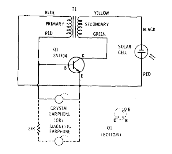 This circuit is from an old documentation of Radio Shack from the 70s. The transistor should preferably be germanium and the transformer is the drive type of old transistor radios. The handset must be magnetic, or a small speaker can be used instead. The cell can be obtained from unused solar calculators.