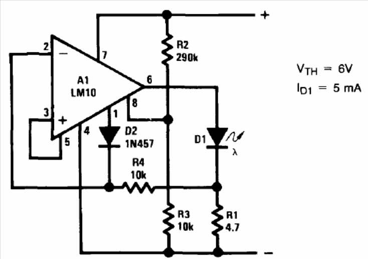We found this circuit in a 1994 Linear Applications Handbook by National Semiconductor. The LM10 is not common today, but we can adapt the circuit to operate with more modern operational amplifiers.