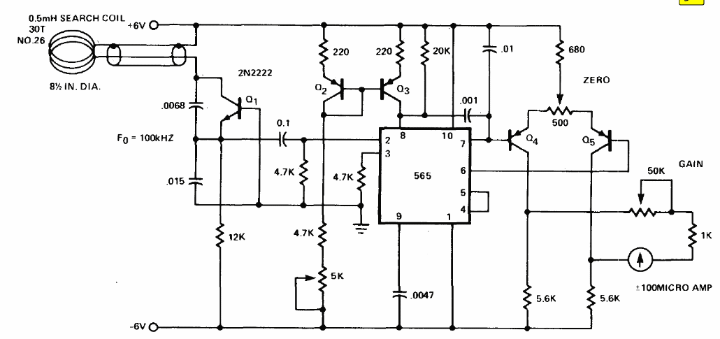 We found this circuit in a Signetics integrated circuit manual. The circuit detects any type of metal. PNP transistors not indicated may be BC558. The coil consists of 30 turns of wire 28 in a plastic form, 30 to 40 cm in diameter.