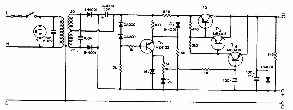 This simple bench source uses only transistors and can supply up to 500 mA with a BD135 for TR2. The other transistors can be BC548 for NPN and BC558 for PNP. The BD must have a heat radiator. With the original transistors the maximum current is less.
