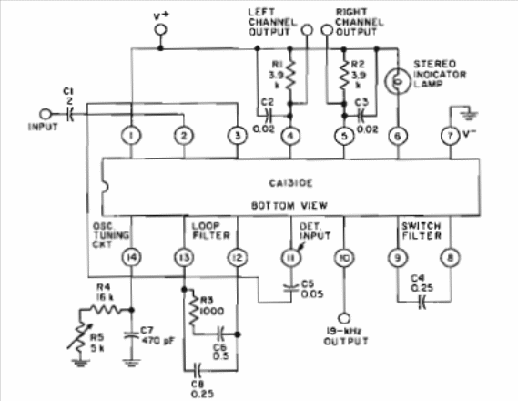 This is the traditional application of the RCA CA1310 integrated circuit, obtained in a 1972 manual. The circuit decodes FM signals from a common receiver, providing audio to the left and right channels. The circuit is powered by voltages from 3 to 12 V.