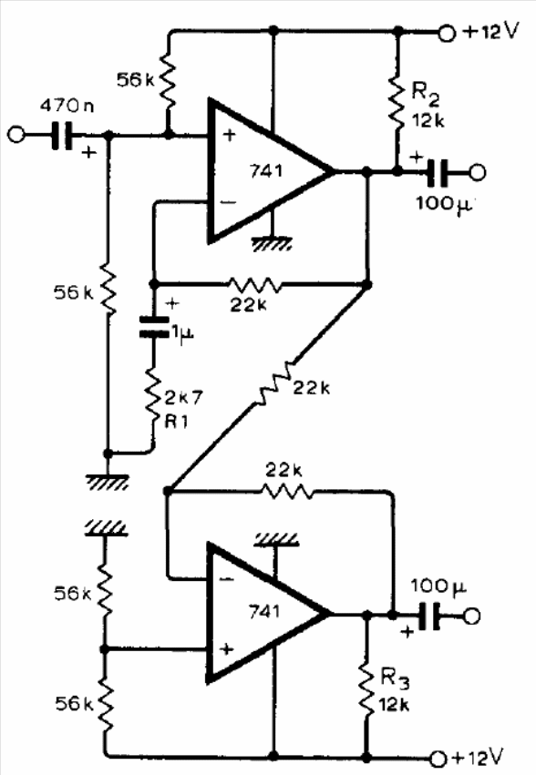 This circuit was found in a 1975 documentation. Operational amplifiers must have a symmetrical source and the frequency response ranges from 10 to 20 000 Hz. The gain is 20 dB and other operational amplifiers can be used.