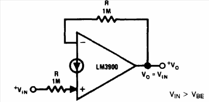 We found the configuration below, with unit gain, in the National Semiconductor Linear Applications Handbook.
