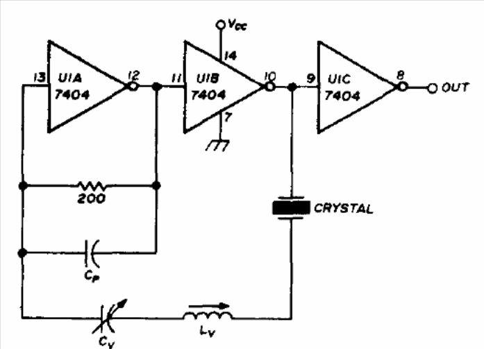 This circuit can generate signals up to 20 MHz, depending on the crystal. The circuit is TTL and must be powered by a voltage of 5 V. L1 must have approximately 100 uH and the adjustable capacitor is 0-100 pF. The circuit provides a rectangular signal serving as a clock for TTL circuits and microcontrollers.