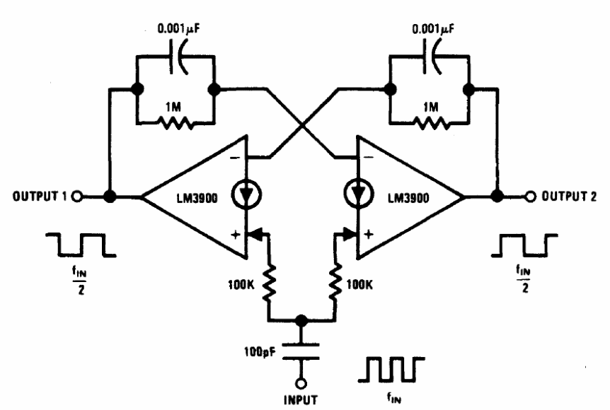 The presented configuration, using two operational transconductance amplifiers, can divide the frequency of a signal by 2. The circuit was found in the 1994 Linear Applications Handbook by National Semiconductor.