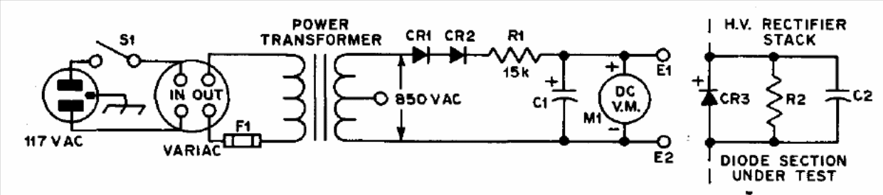 This circuit tests the reverse voltage of power diodes. The transformer is high voltage and so are the rectifier diodes. The circuit is from a 1976 QST magazine.