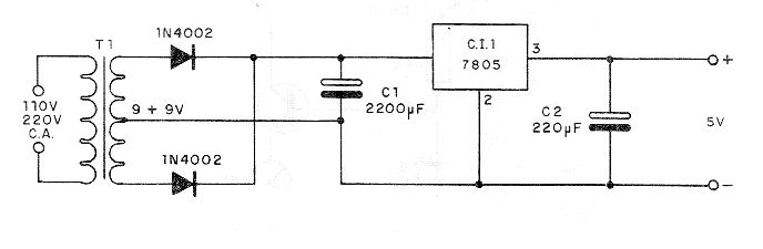 This is a simple Power supply for TTL circuits using the 7805 IC. This IC can source up to 1 A to TTL circuits and must be mounted on a heatsink. Exists another vesion for the 7805 rated to 200 mA. This version is found in SOT-54 packages. Transformer has a secondary rated to 1 A or more in the 1 A version.