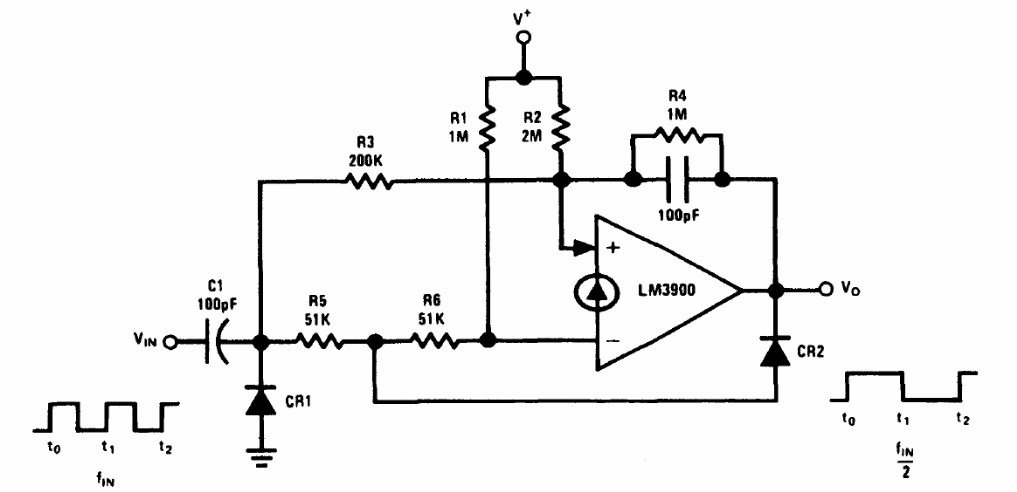 The presented circuit can work as a divider by 2 of frequency. The base is an LM3900, operational transconductance amplifier. The circuit was found in the National Instruments Linear Applications Handbook published in 1994.