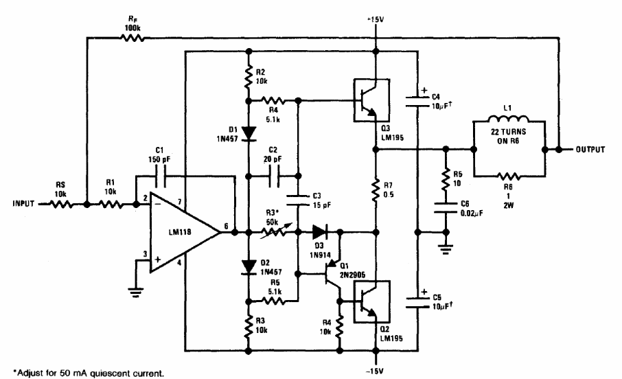 This circuit is suggested by National Semiconductor in its Linear Applications Handbook. It makes use of special power transistors, not easy to obtain and the operational admits equivalents. National does not indicate the circuit's power.
