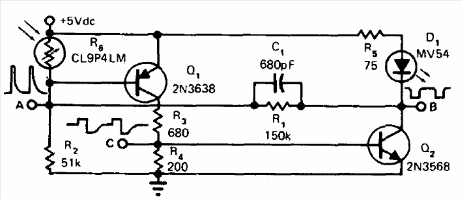 We found this circuit in a documentation from the 75s. Transistors admit equivalents such as BC558 and BC548. LDR is common. The circuit produces 5 kHz pulses when the LDR is illuminated. The indicator LED can be of any type. The signal output is rectangular TTL compatible.