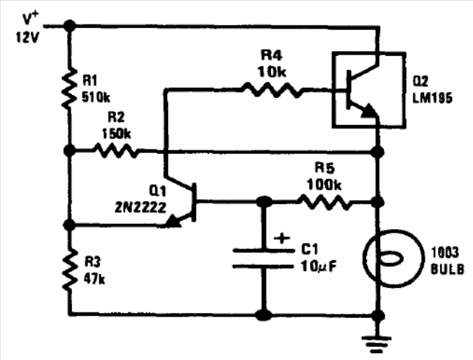 The LM195 is a fast power transistor from National Semiconductor not very easy to find today. C1 determines the frequency of the lamp blinks. The circuit is from the Linear Applications Handbook. Equivalents can be used to obtain the best type through experimentation.