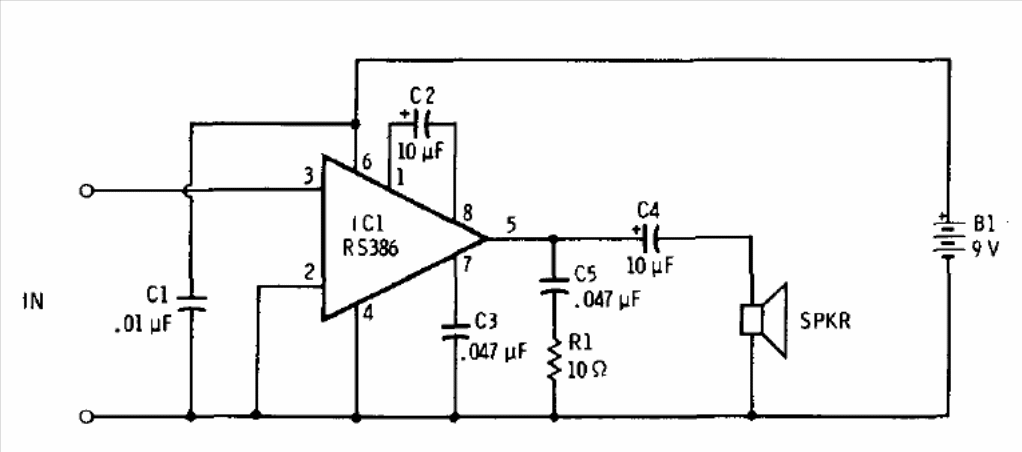 The integrated circuit shown in the figure is nothing more than the LM386 sold by Radio Shack, according to 1977 documentation. Powered by 9 V the circuit provides 250 mW. The circuit can also be powered by 6 V with less power and its gain is 200.