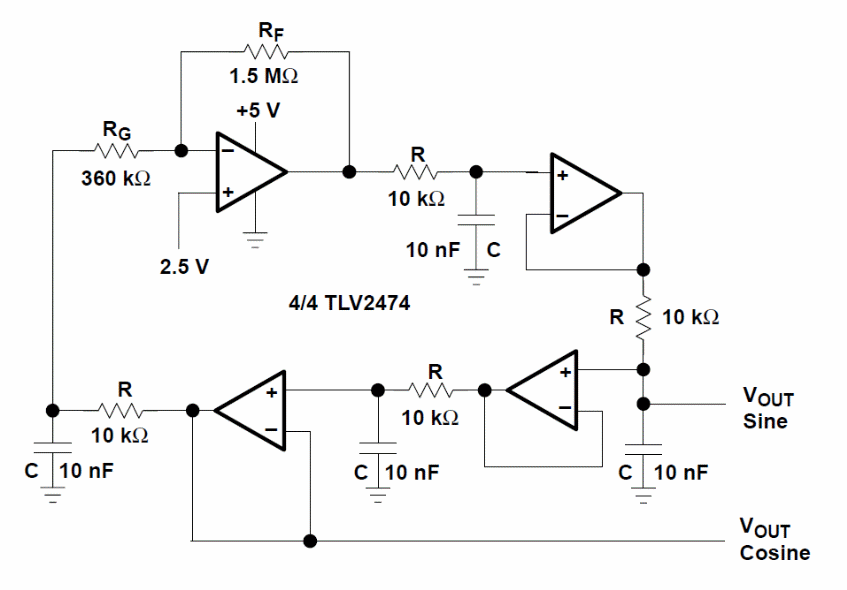 This configuration with 4 operational generates a signal of approximately 1.5 kHz, having been found in a Texas Instruments documentation. The signal is sinusoidal, and the frequency can be changed by changing the R and C components of the circuit. The maximum frequency will depend on the characteristics of the operational amplifiers.