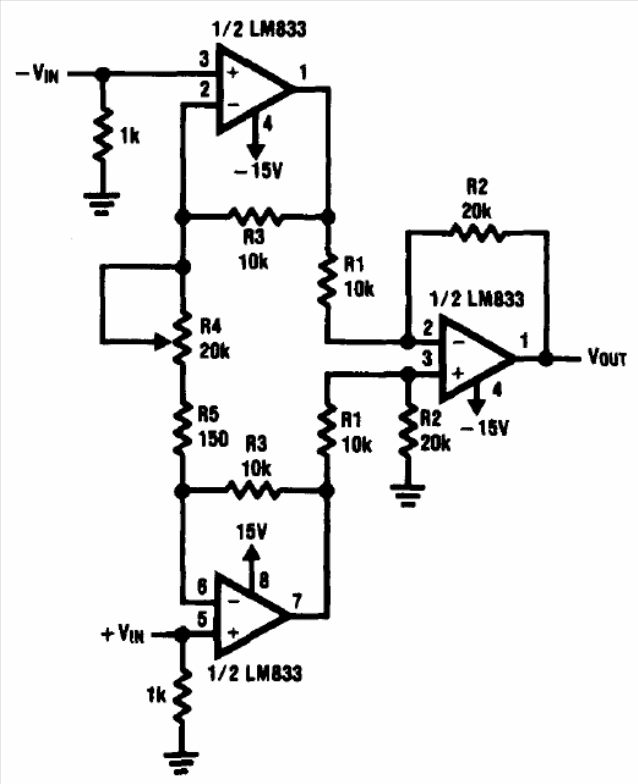 This circuit is based on the operational amplifier LM833 which is not a common component today. The circuit is from the 1994 National Semiconductor Linear Applications Handbook, requiring a symmetrical power supply.