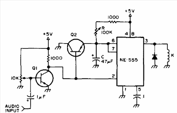 The displayed relay operates with an audio signal applied to the input. The transistors can be BC548. For less sensitive relays, it is convenient to use an excitation step with a transistor. The activation time depends on the RC constant that can be changed.