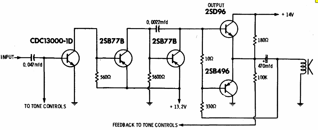 This circuit of a few watts of output is from a publication of 1971. We can assemble it with modern transistors such as BC548 for the BC558 preamplifier for drivers and the pair BD135 and BD136 for output transistors. The speaker is 8 ohms.