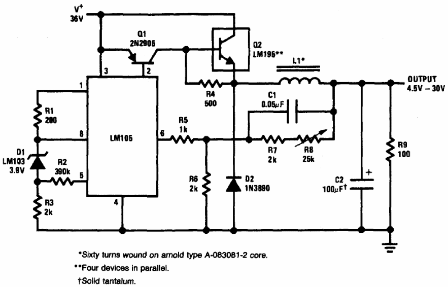 The components used in this circuit are not common today, but the configuration can serve as a basis for more modern projects. The circuit is suggested by National Semiconductor in its Linear Applications Handbook.