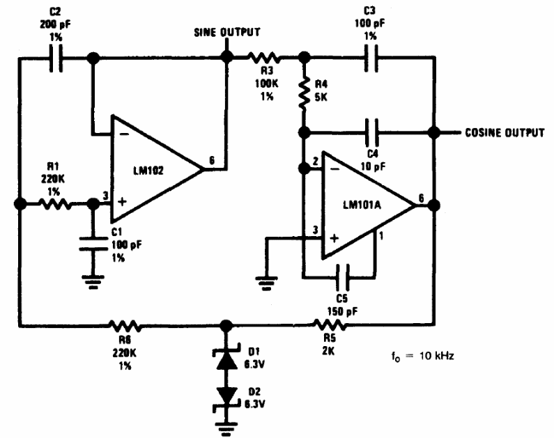 The circuit presented was obtained in the Linear Applications Handbook of the National Semiconductor of 1994. The configuration can be implemented with other operational amplifiers and the capacitors modified to generate other frequencies. The power supply must be symmetrical.