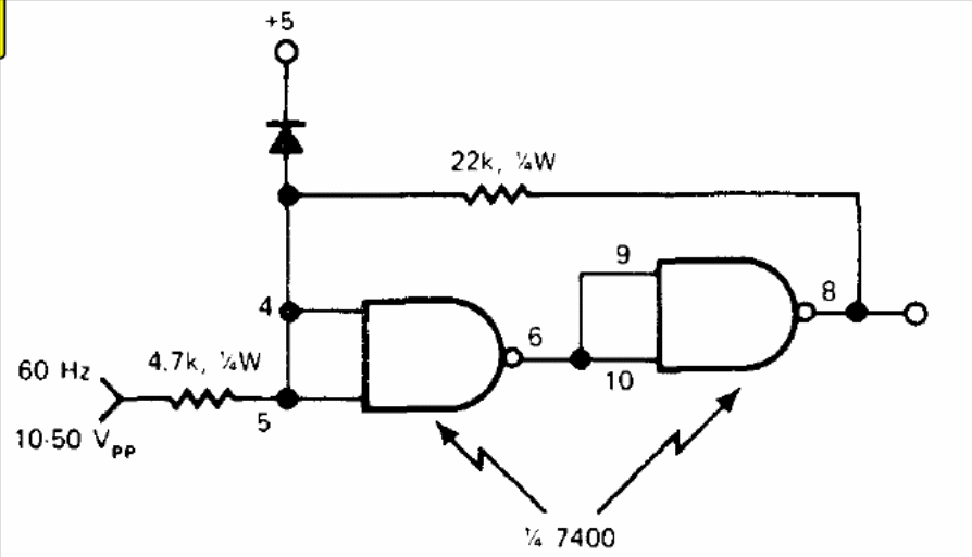 In the figure we have the way to implement a TTL Schmitt trigger for 60 Hz signals, obtaining pulses at this frequency. The circuit must be powered by 5 V and the diode is for general use. The circuit can be used in microcontrolled applications.