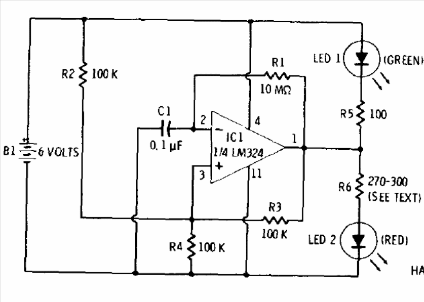 The circuit shown causes two LEDs to alternately flash at a frequency given by the capacitor. The circuit can be powered by voltages from 6 to 12 V, depending only on the values of R5 and R6 being increased to voltages of 9 and 12 V. The circuit is from a 1975 Radio Shack documentation.