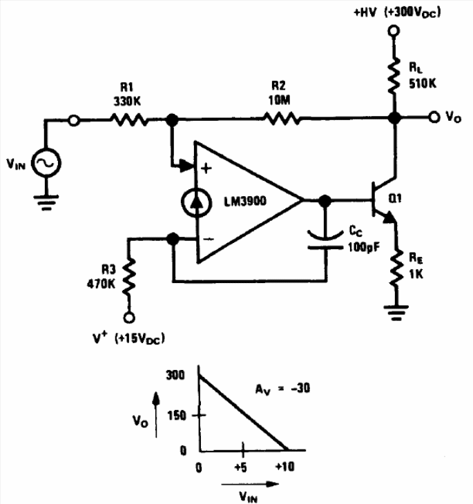 We found this circuit in the Linear Applications Handbook of the 1994 National Semiconductor. The transistor must be a high voltage type and the LM3900 power supply must be symmetrical.