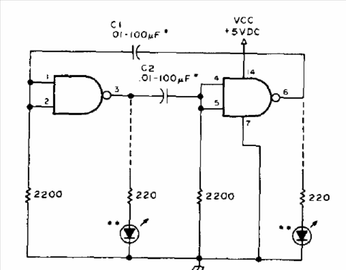 This traditional TTL configuration was obtained in a 1977 documentation. The supply must be made with 5 V and the capacitors can be changed for operation at other frequencies.