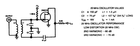 This stable 20 MHz oscillator was suggested by the National Semiconductor's Linear Applications Handbook from 1994. The FET can be of a common type like the BF245. Details of the components, mainly the coil are given on the side.