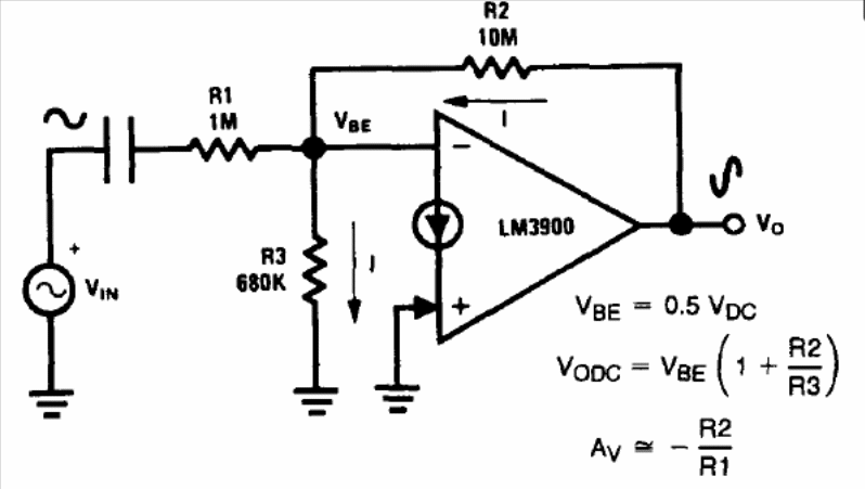 In the figure we have the basic configuration of an inverter transconductance amplifier, as suggested by National Semiconductor in its 1994 Linear Applications Handbook. The formulas for calculating the components are given next to the diagram.