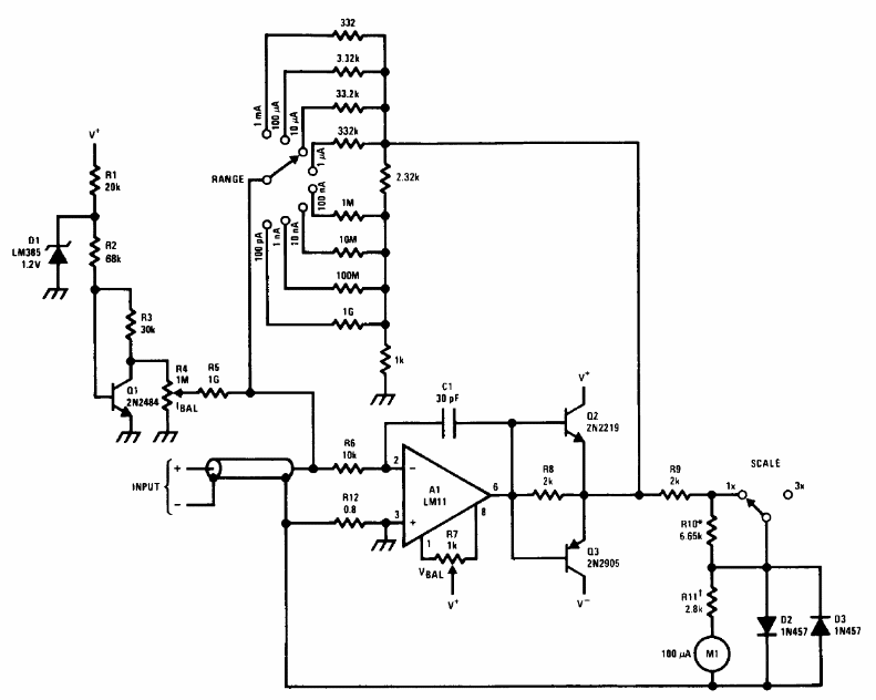 The circuit shown uses an operational amplifier that is uncommon nowadays. The circuit was obtained in a 1994 Linear Applications Handbook by National Semiconductor.