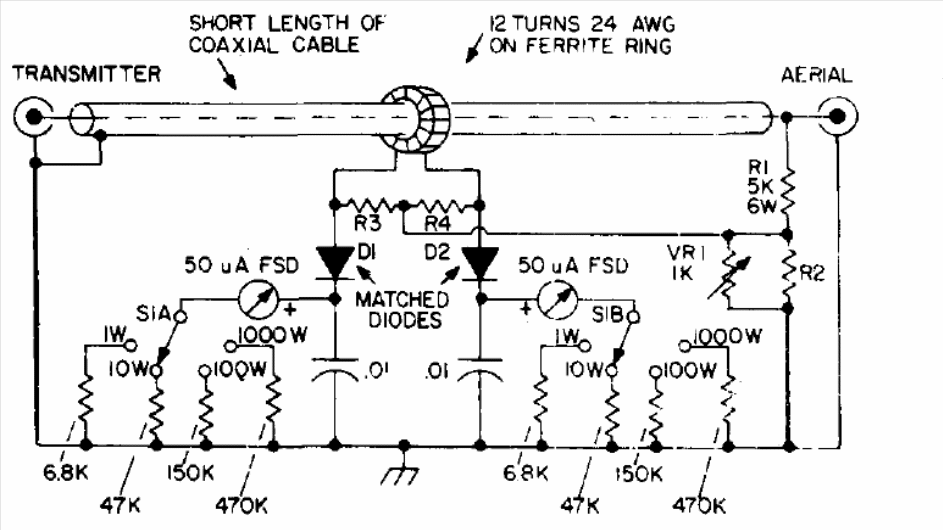 We found this wattmeter that operates between 100 kHz and 70 MHz in a 1974 amateur radio documentation. The coil consists of 12 loops of wire 28 in a ferrite ring. The diodes can be germanium, giving preference to married types. By the difference between direct and inverse power, ROE can be calculated.