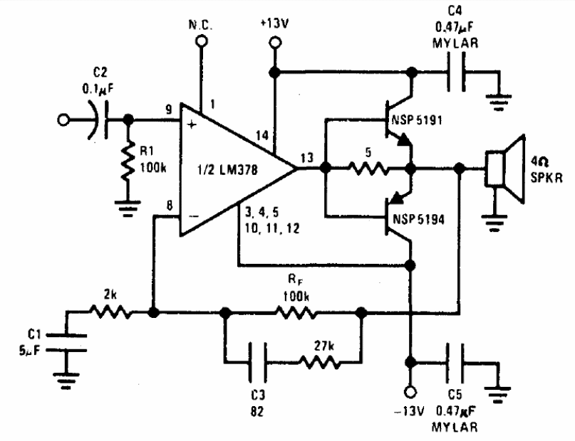The integrated circuit of this amplifier is not very common today. The output transistors can be TIP31 and TIP32 in heat radiators. The circuit is from the 1977 National Semiconductor Audio Handbook.
